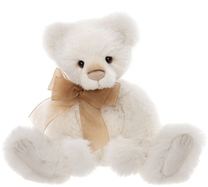 Made from super soft white plush fur, fully jointed and sporting a bronze coloured organza bow.