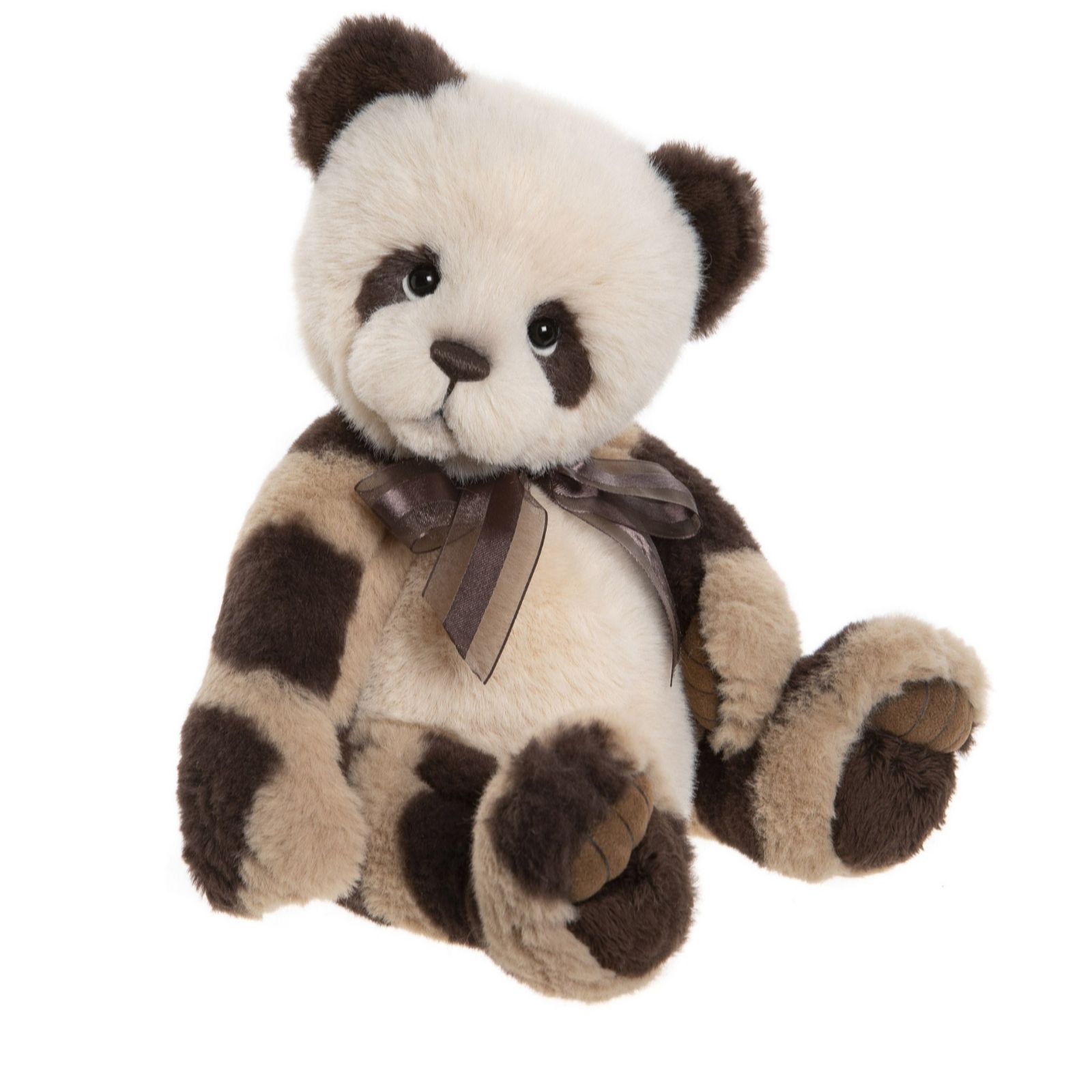 Rascal is part of Charlie Bears 2020 Secret Collection. This beautiful panda character has patch-worked limbs in coffee and caramel brown tones with a soft cream face and tummy. He has an adorable hand stitched nose, mouth and tickly toe detailing on all four of his paws. Rascal has a lovely organza ribbon bow in a matching brown along with the signature Charlie Bears “who me”? look.