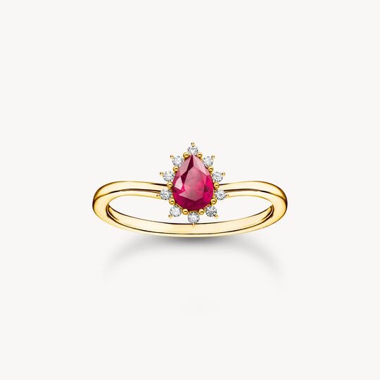 This Vintage Romance ring made of recycled 925 sterling silver with high-quality 18k gold plating is a declaration of your love for your own, personal style. Its curved design and stone embellishment exude a distinctive retro flair. A red Lab Grown sapphire with a drop cut is the centre piece. Small, white zirconia stones with a round cut are set by hand around the sparkling eye catcher.