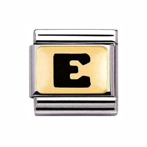 Nomination Composable Classic Black Letter E Gold Charm. Crafted from stainless steel and 18ct gold, add a personalised touch to your bracelet with this charm.