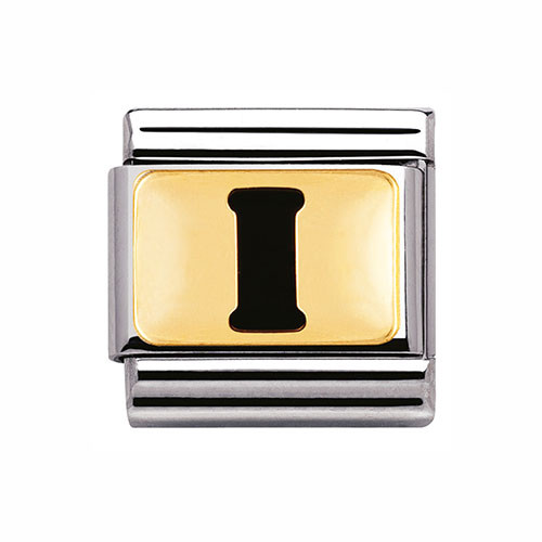 Nomination Composable Classic Black Letter I Gold Charm. Crafted from stainless steel and 18ct gold, add a personalised touch to your bracelet with this charm.