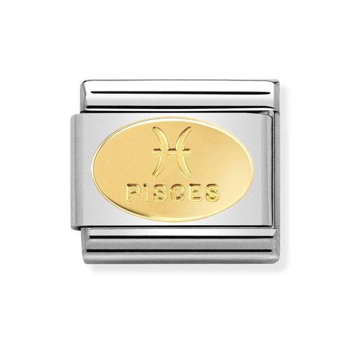A classic Nomination charm which consists of the Pisces Zodiac symbol and name engraved on an 18ct gold plated oval design.