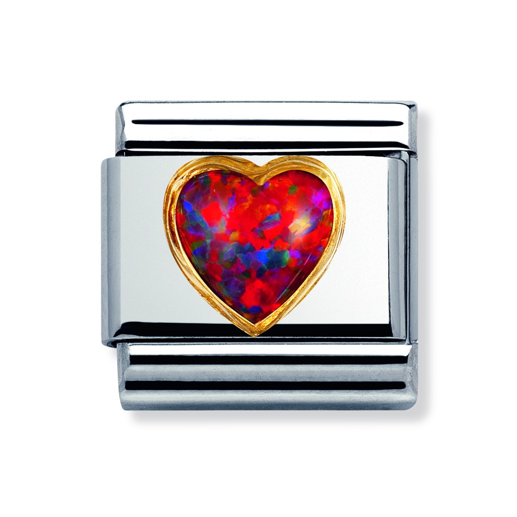 The Nomination Red Opal Heart Charm features a raised heart of red opal surrounded by a trim of 18ct gold, all set on a bed of polished stainless steel. Red opal is believed to bring protection and stimulate enthusiasm.