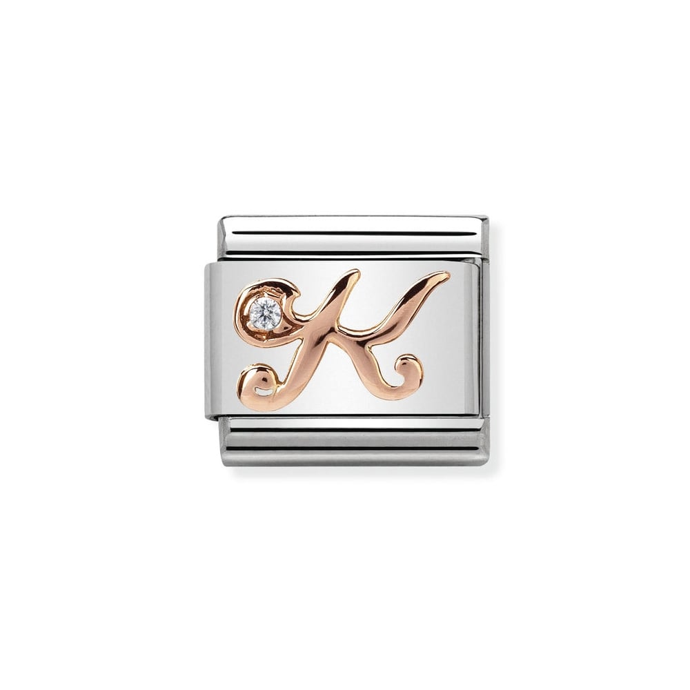 The Nomination stainless steel, 9ct Rose Gold and cubic zirconia Letter K charm is hand-made in Italy. This is a fantastic little charm for those who have something special to say or just add more letters to create your own message or someone’s name.