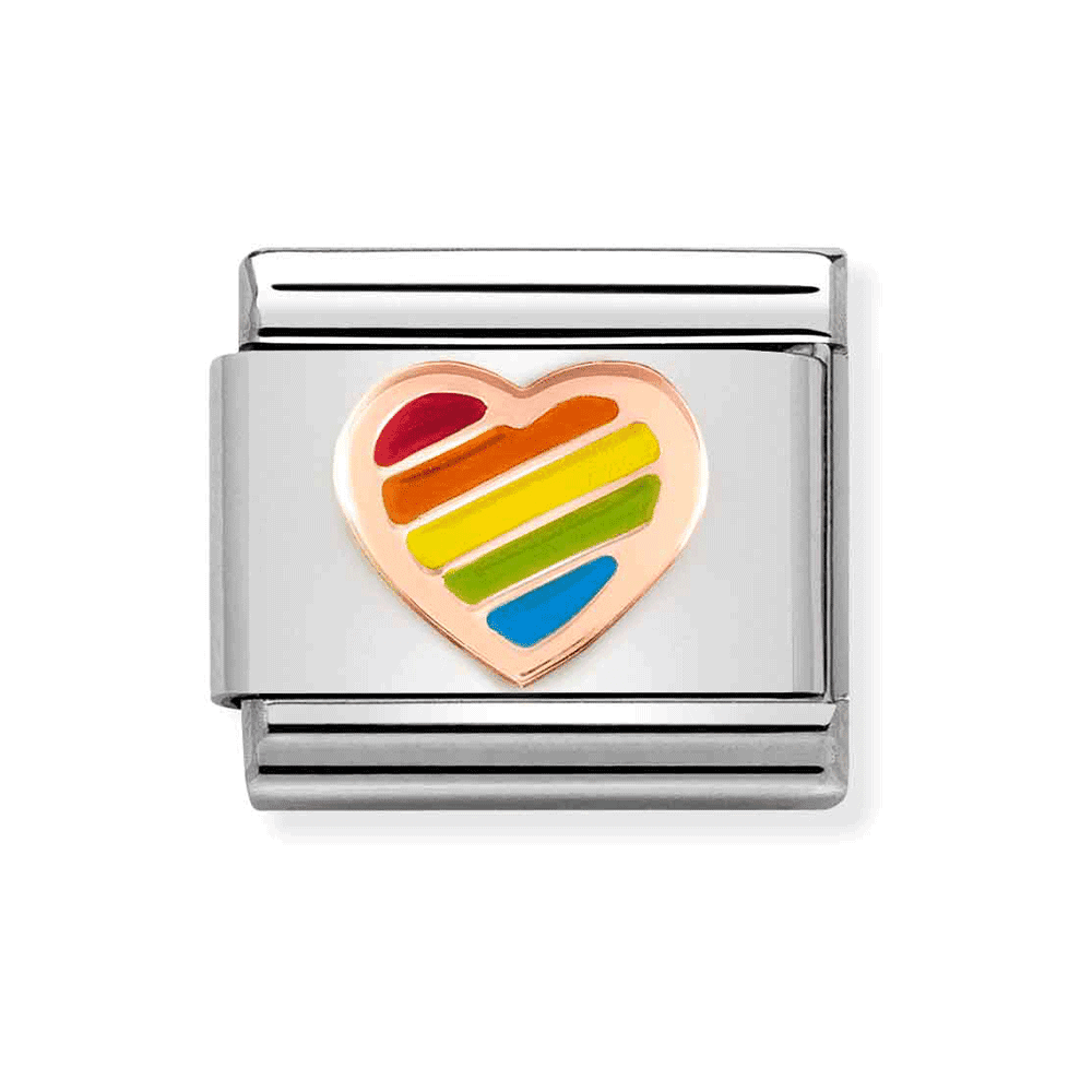 This beautiful Classic Rose Gold Mixed Colour Heart charm is crafted from 9ct Rose Gold, with hand painted rainbow enamel detailing and set on a base of stainless steel.