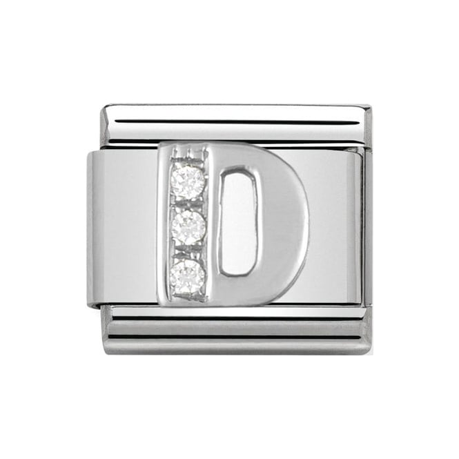 The Nomination D charm is crafted from sterling silver and set on a bed of stainless steel, with cubic zirconias for extra special detail.