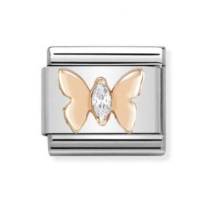 Nomination Classic Silver Pink Butterfly charm featuring a pink butterfly with a synthetic stone in the middle. The delicate pink hue of the butterfly exudes a sense of grace and femininity, while the synthetic stone adds a touch of sparkle and elegance to the design.