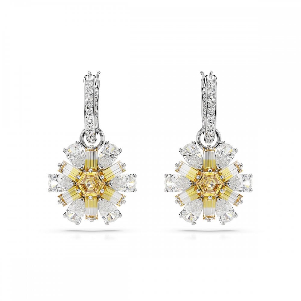 These bright and delicate pierced earrings are filled with colour and character. Each rhodium-plated piece is attached to a mini hoop adorned with clear crystals and features a vibrant flower, precisely crafted from yellow and clear Swarovski Zirconia, with a striking gradient effect for added modernity.