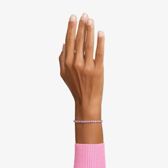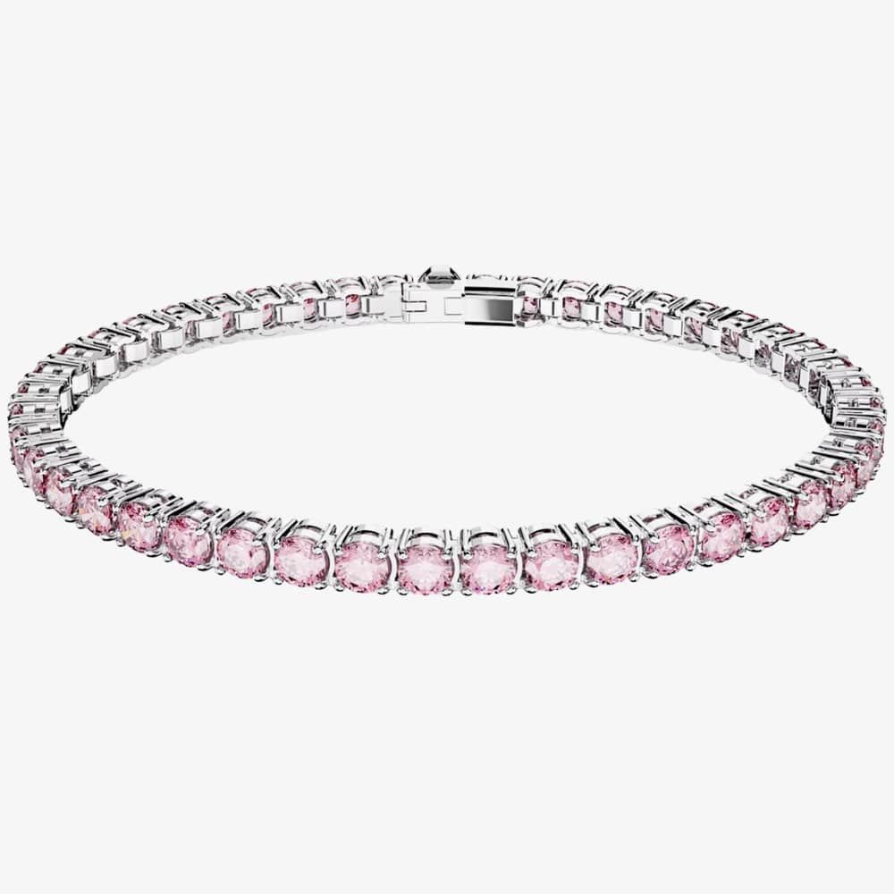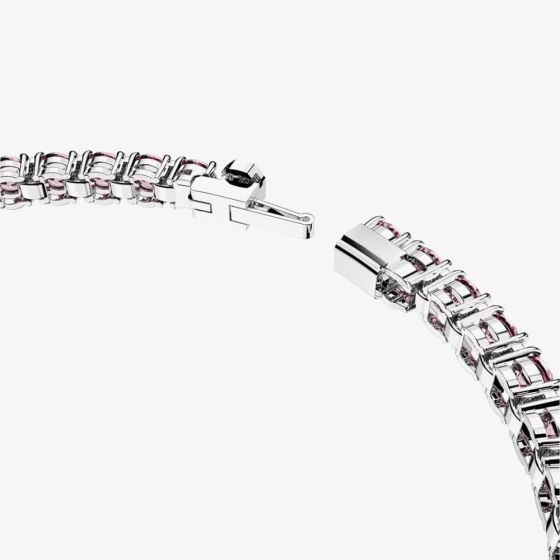 This design features a row of round purplish pink stones on a rhodium plated setting for a combination that is truly alluring. Wear it alone, or pair it with other pieces from the Matrix Tennis family.